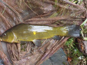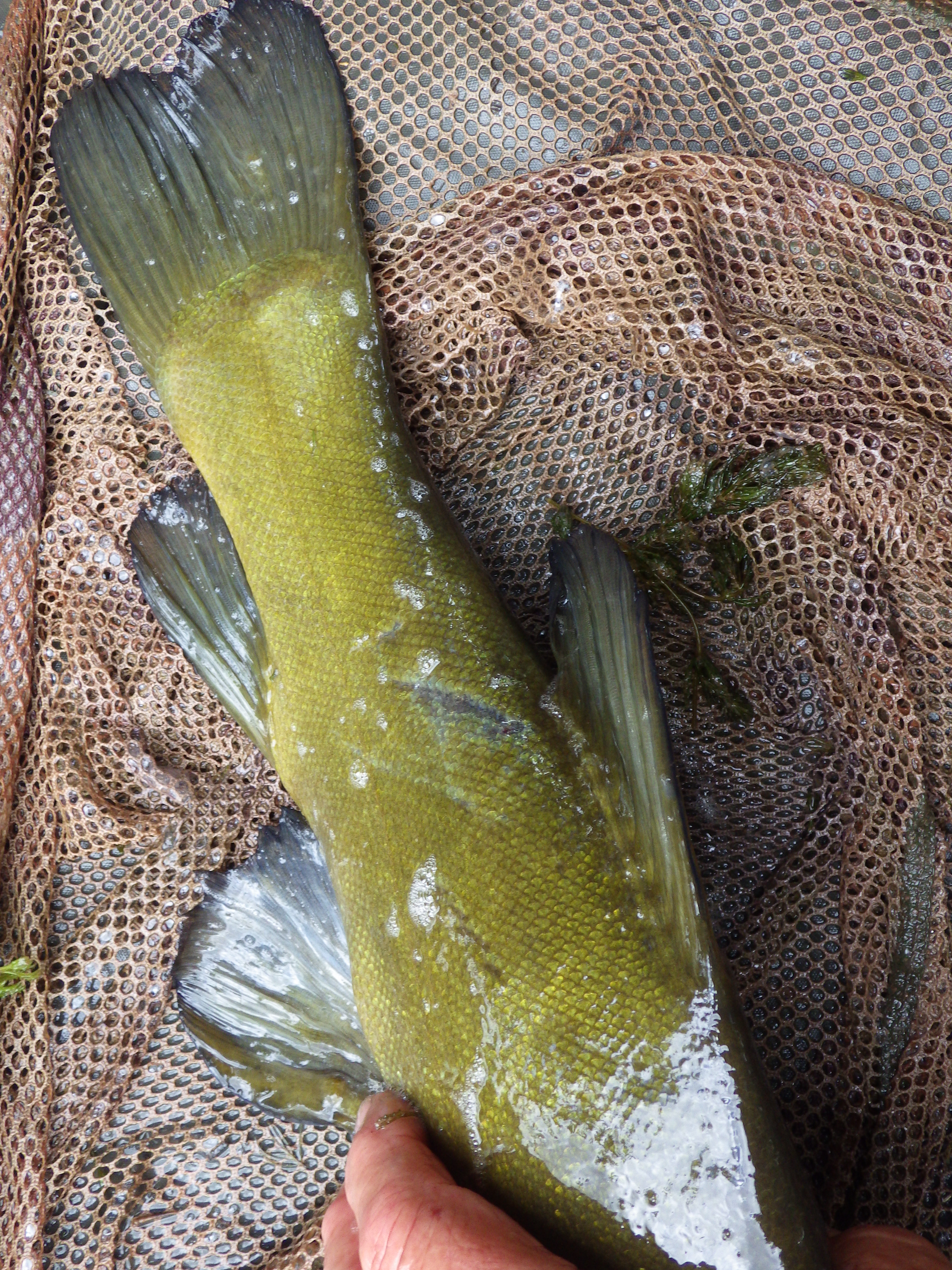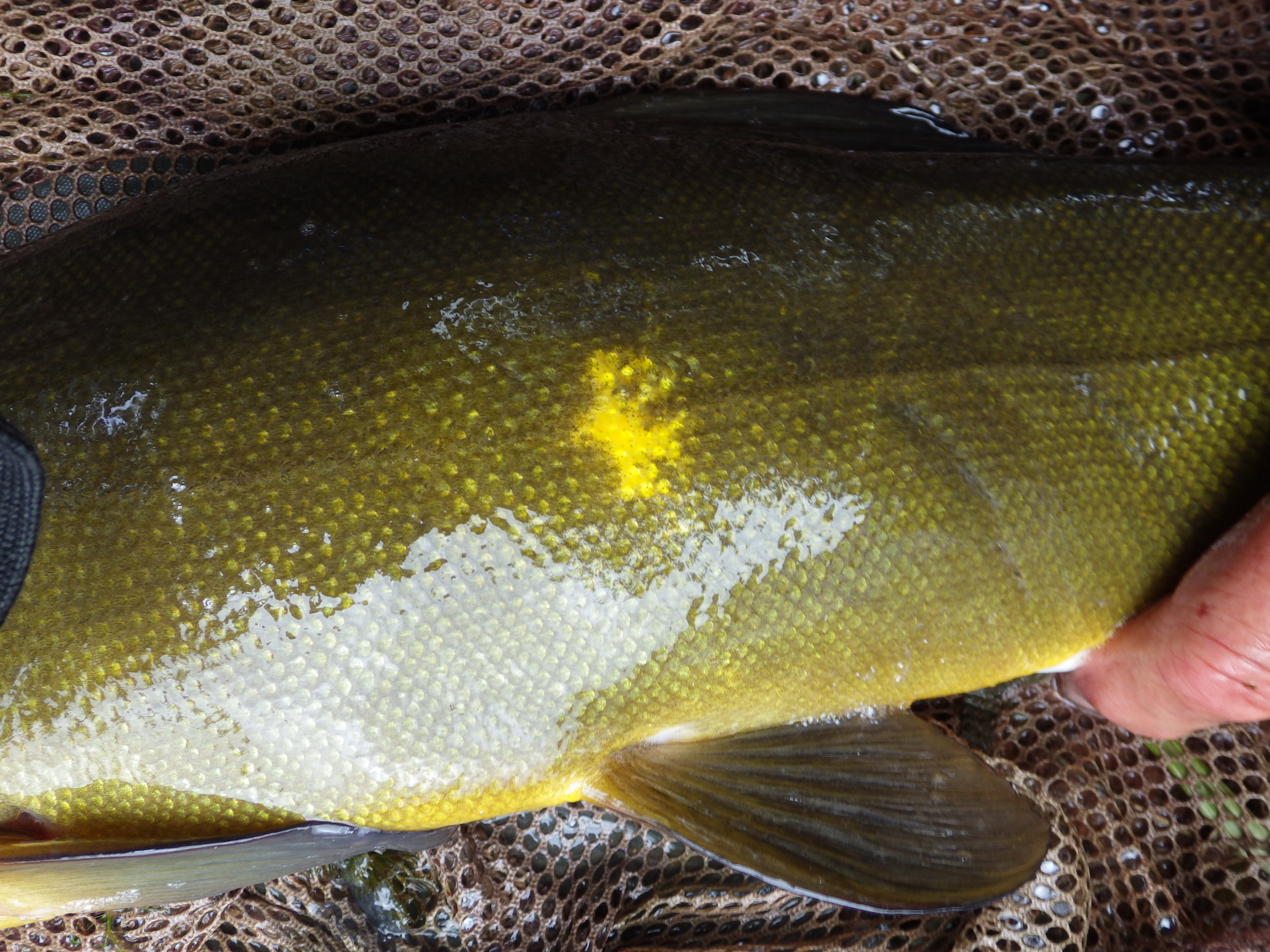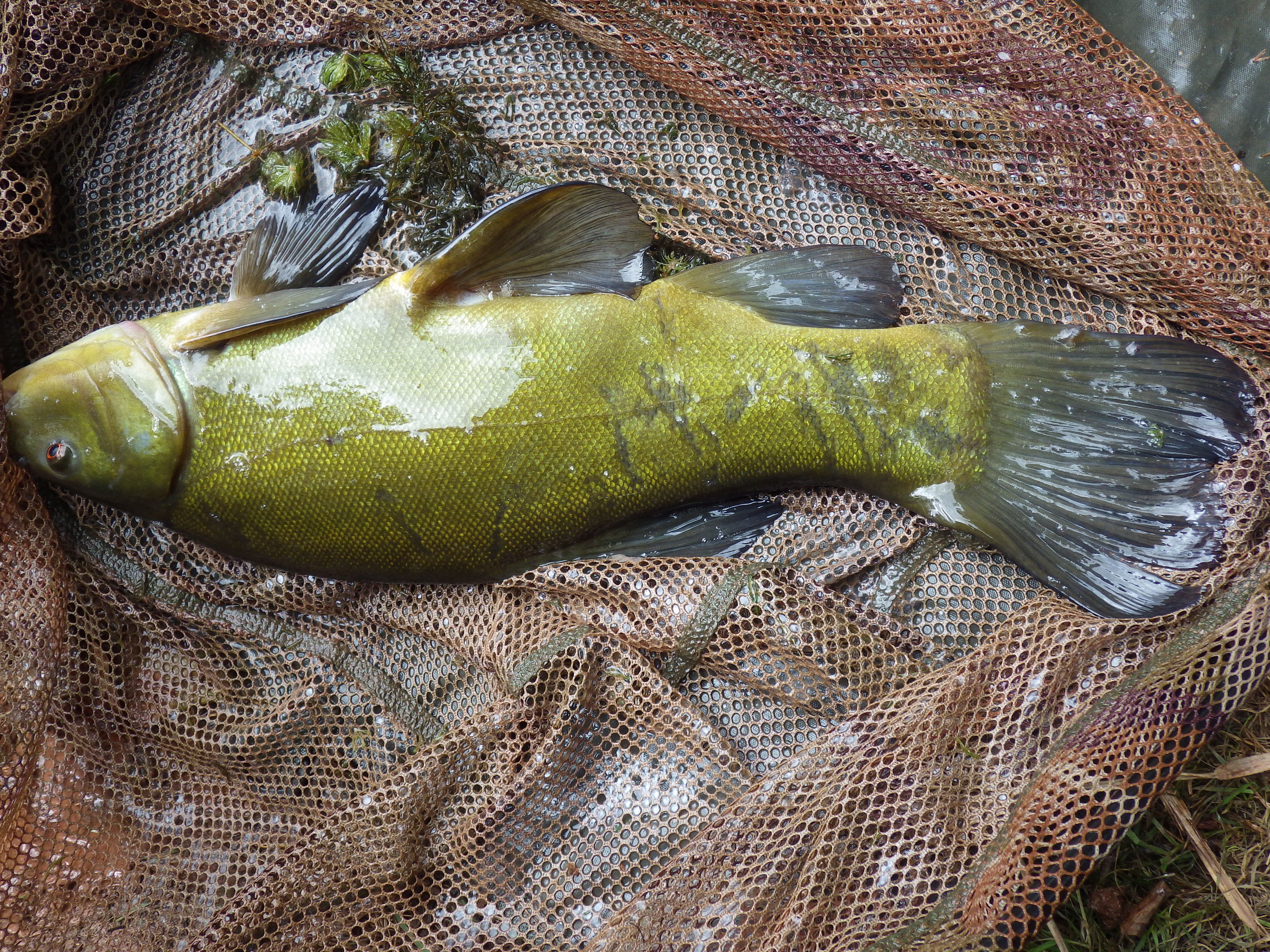 About 15% of our tench in the large lake bear distinctive marks. This may be a ragged tail, fin or a scar. Sometimes symmetrical bill marks on each flank from a cormorant or goosander. Then there are the “freckled” ones with small red/orange spots in distinctive patterns. Occasionally there is a fish with a golden blotch, also very distinctive. Or a notch or tear in a fin. There must be more than one very old skinny lady here but this one turns up in 4 out of 5 visits. Once I caught her twice within an hour. Perhaps she is following me around the lake.