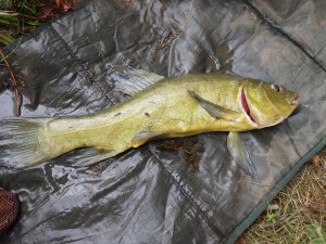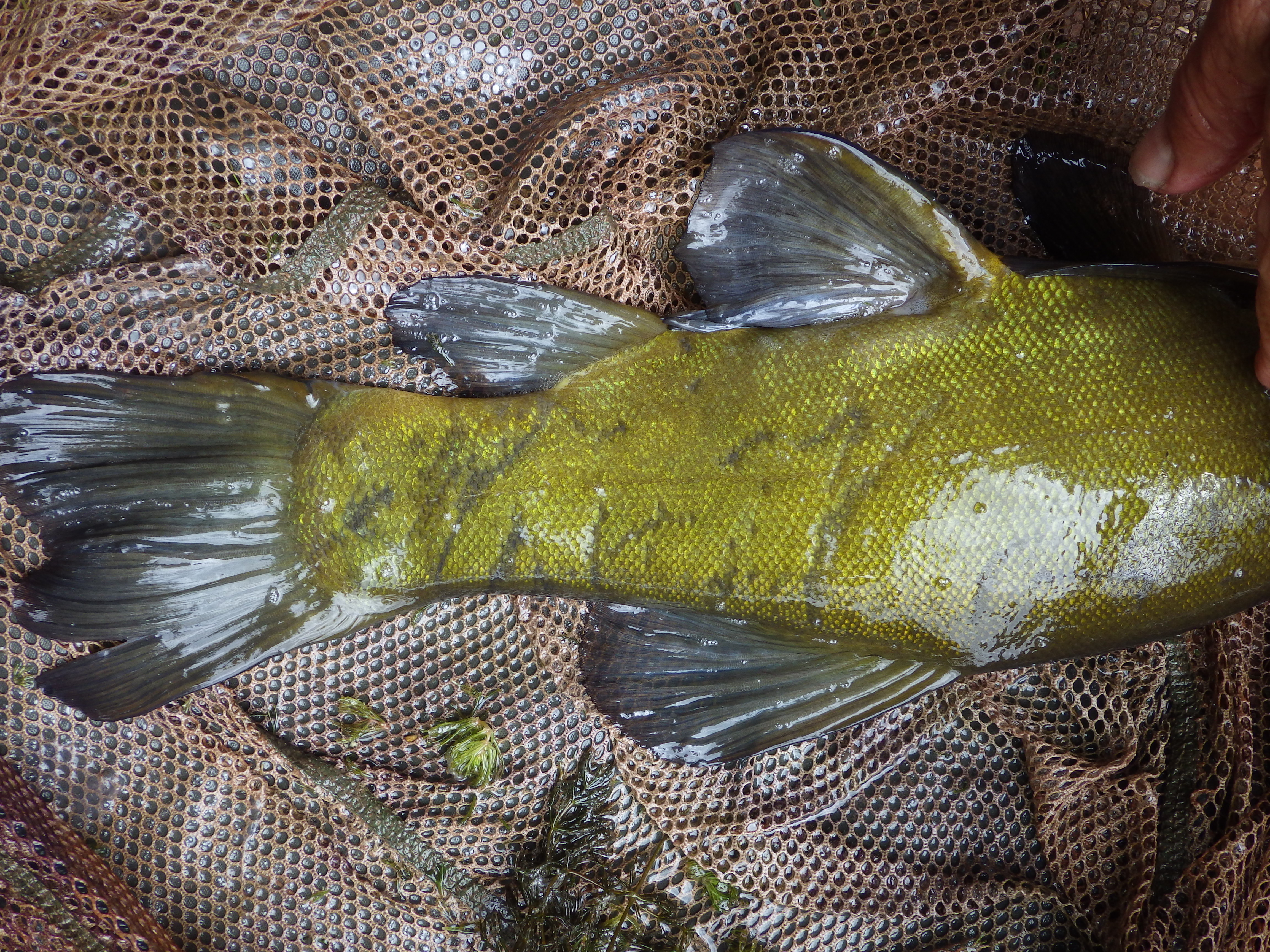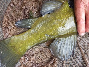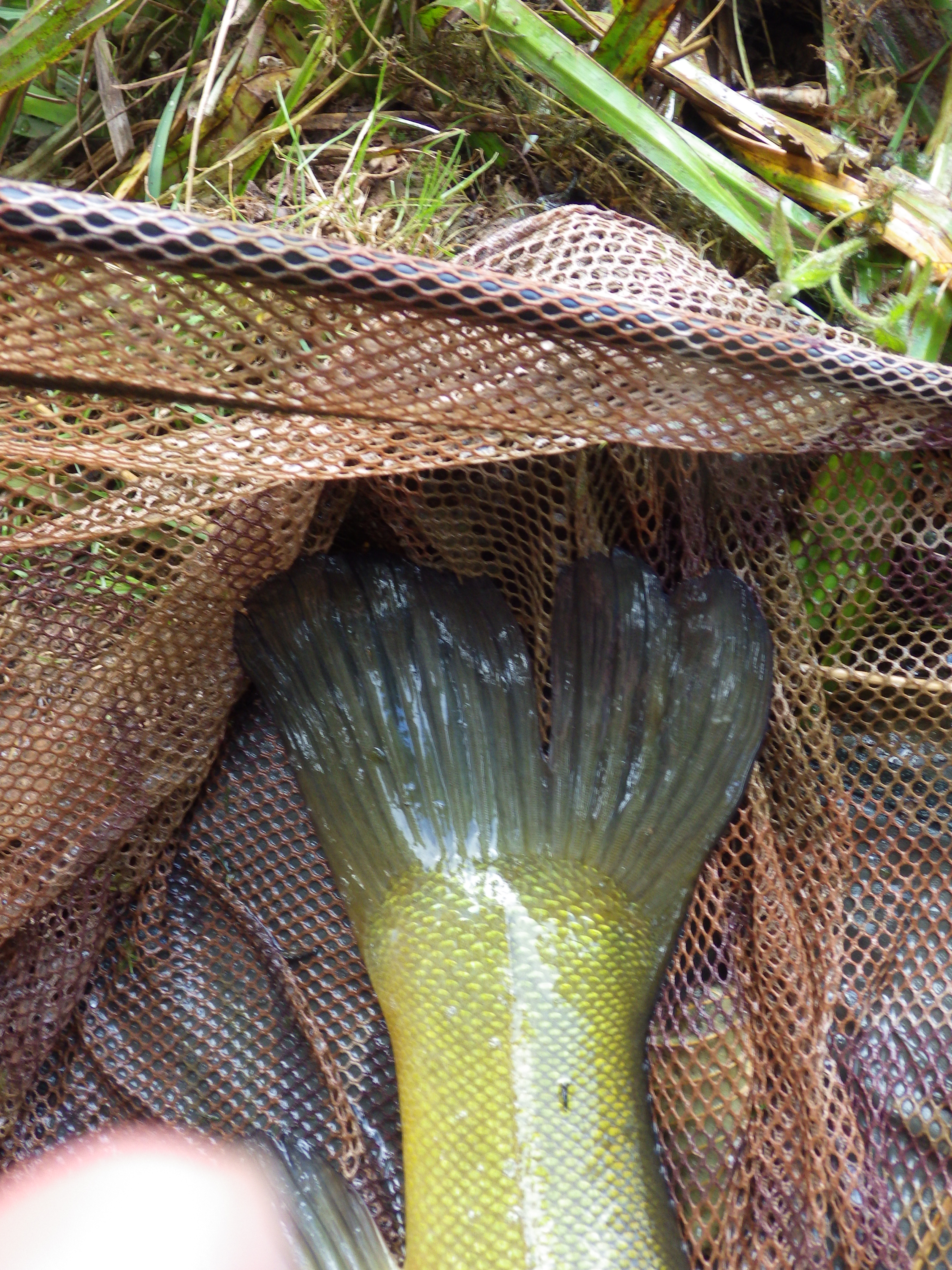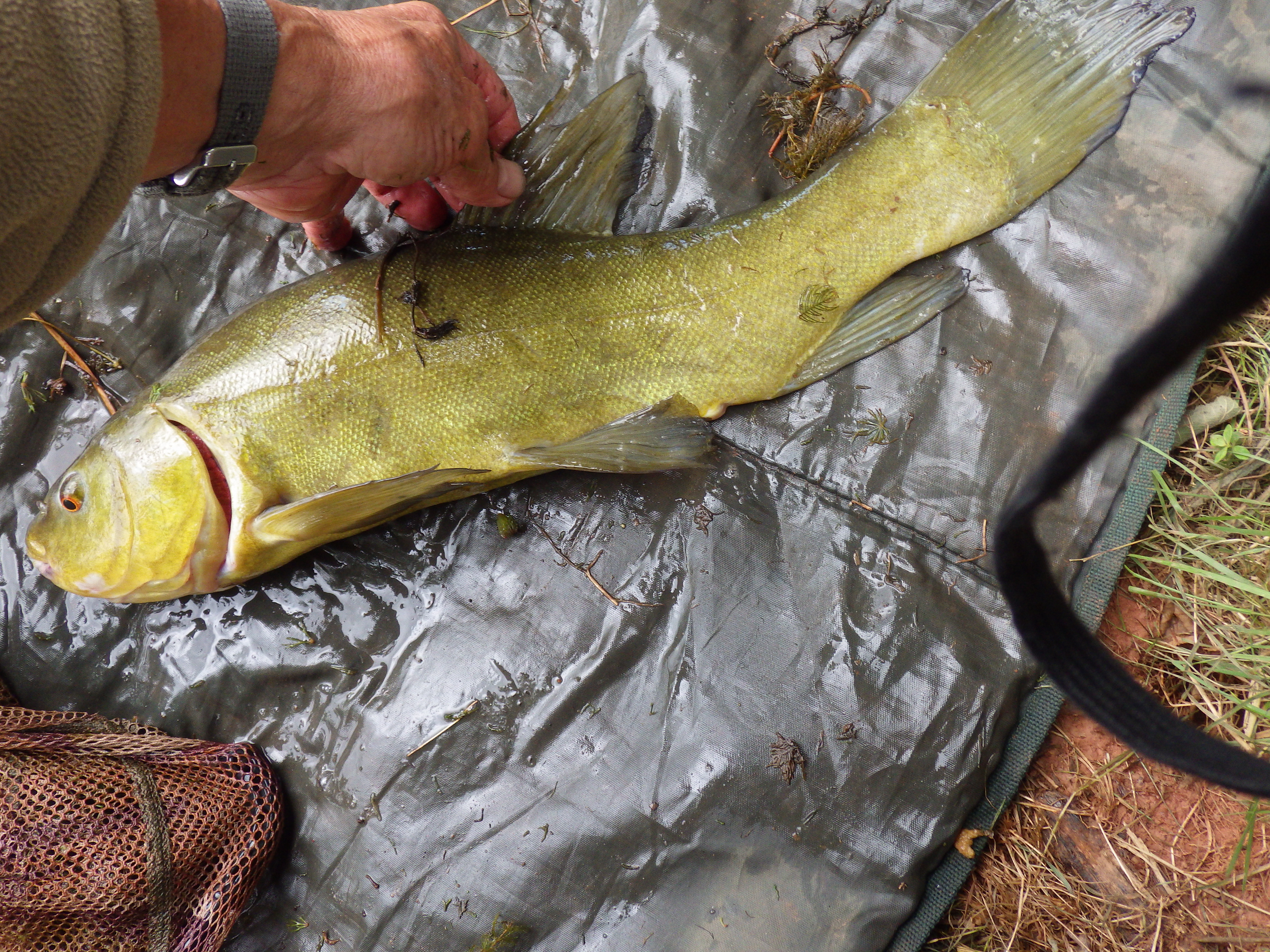 About 15% of our tench in the large lake bear distinctive marks. This may be a ragged tail, fin or a scar. Sometimes symmetrical bill marks on each flank from a cormorant or goosander. Then there are the “freckled” ones with small red/orange spots in distinctive patterns. Occasionally there is a fish with a golden blotch, also very distinctive. Or a notch or tear in a fin. There must be more than one very old skinny lady here but this one turns up in 4 out of 5 visits. Once I caught her twice within an hour. Perhaps she is following me around the lake.