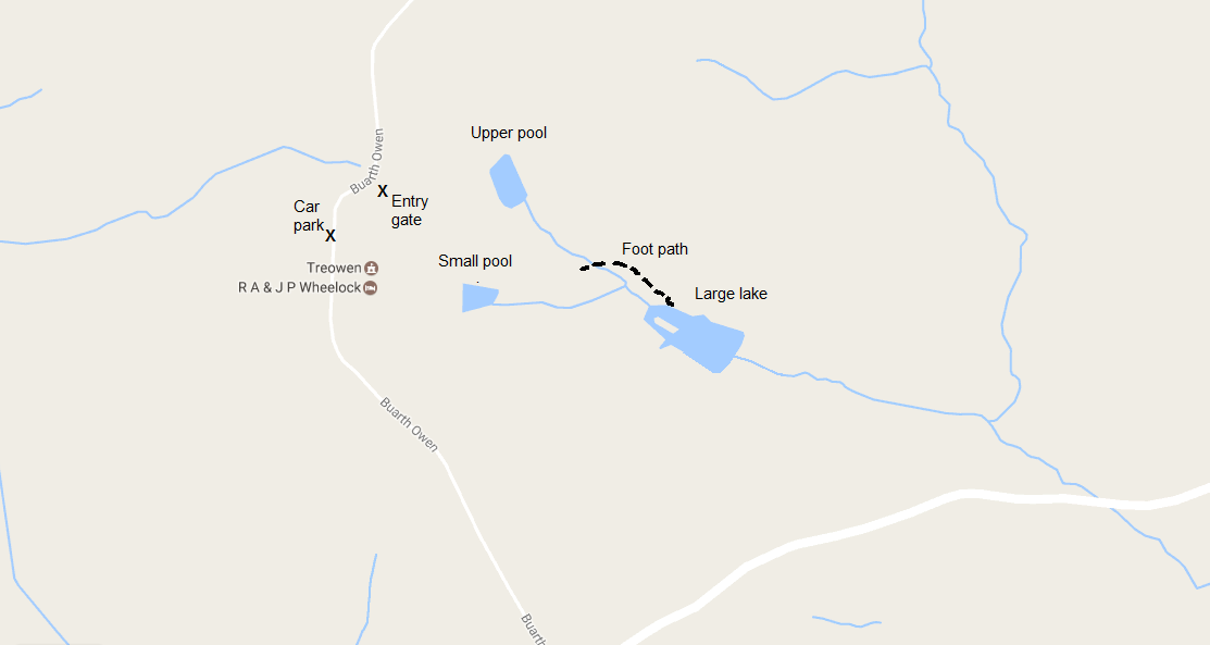 To get there, from Jingle Street to Dingestow road, take the concrete private ‘road’ on the right at the hilltop signed “Treowen”. Drive past Treowen House and past the house guest parking area to the designated M&DAS parking area a little further down the track, just round the bend past the gates on the right. Cross into the field behind the right-hand gate. You will see Brick Kiln Lake and Little Lake down the hill from here.
